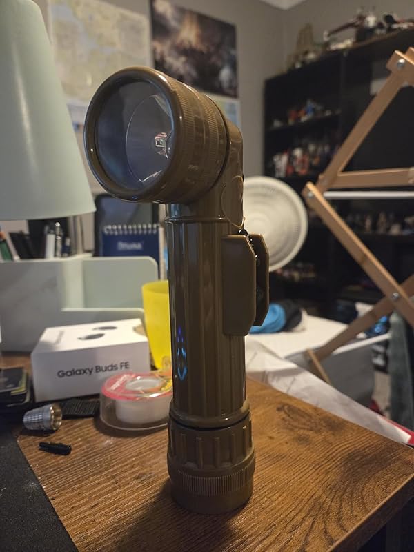 This military-style D-cell angle flashlight combines functionality with durability, featuring a Durable, Lightweight, and Waterproof Plastic Construction. This versatile illumination tool is designed for tactical applications and includes multiple filter lens options for specialized signaling needs.Rugged Construction: Durable, Lightweight, and Waterproof Plastic Construction ensures reliable performance in challenging conditionsMulti-Mode Functionality: Features an angle head design with specialized switch for Morse code signaling capabilitiesVersatile Lighting Options: Includes interchangeable filter lenses in red, blue, yellow, and green for tactical applicationsPractical Design Features: Equipped with a metal ring for gear attachment and convenient belt clip, plus includes a spare bulb for extended reliability Disclaimer: AI summary based on product information