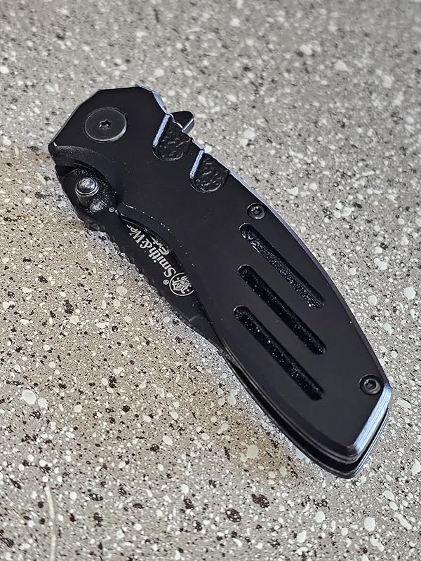 About this item DIMENSIONS: 7.1 Inch (18 Cm) Overall Length With A Blade Length Of 3.1 Inches (7.9 Cm) And A Weight Of 3.5 Ounces DURABLE: Blade Is Made Of Reliable 7Cr17Mov Black Oxide High Carbon Stainless Steel With A Black, Aluminum Handle DEPENDABLE: Quick And Easy Access With The Convenient Pocket Clip, Finger Flipper And Ambidextrous Thumb Knobs Making It Ideal For Everyday Carry SECURE: Have Confidence That The Blade Will Not Slip With The Security Of The Liner Lock BE PREPARED: Knife Features Jimping And Serrations GUARANTEED: This product is covered by a Limited Lifetime Warranty. For questions or contact us on the Smith & Wesson website